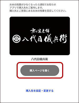 お米の在庫量が設定した量を下回ったら通知が届きます。よく使う発注先のwebサイトを登録すると、そのまま発注先サイトにアクセスできます。