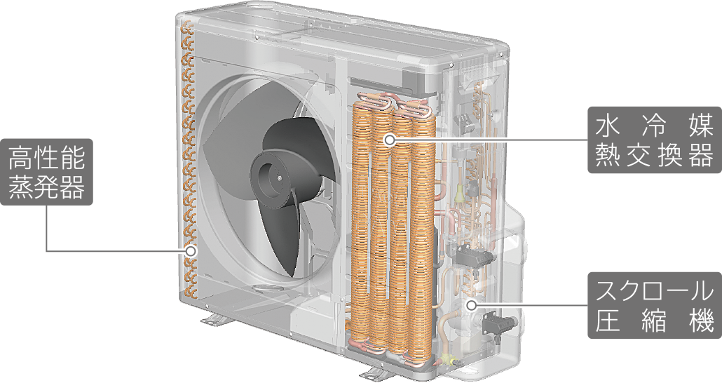 日立独自の吸熱性能が優れた高性能蒸発器、効率良く冷媒を圧縮するスクロール圧縮機、熱交換性能が高い水冷媒熱交換器も採用して高効率にお湯を沸き上げます。