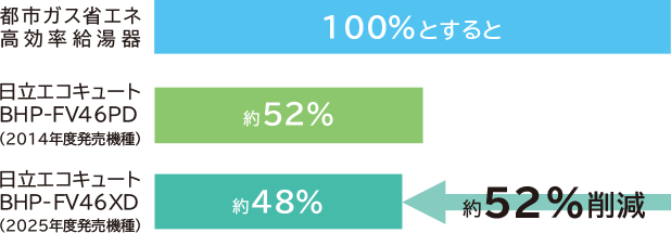 〇エコキュート型式:BHP-FV37PD(運転モード:おまかせ節約)で33,296円/年(税込)、BHP-FV37XD(運転モード:おまかせ節約)で30,918円/年(税込)、BHP-FV46PD(運転モード:おまかせ節約)で34,172円/年(税込)、BHP-FV46XD(運転モード:おまかせ節約)で31,672円/年(税込)、都市ガス省エネ高効率給湯器24号タイプ(機器効率95%)で66,420円/年(税込)