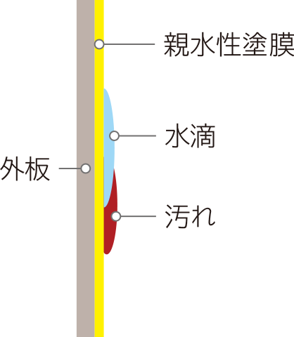 外板表面の親水性塗膜により水滴がなじみ、汚れの下に入り込んで洗い流されるので汚れのスジができにくい。