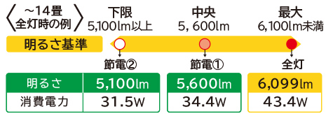 全灯でお使いのときは明るさ基準内中央の明るさ(節電①)と下限の明るさ(節電②)に減光、全灯以外のときは約15%(節電①)と約30%(節電②)減光して消費電力を節電します。