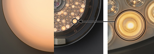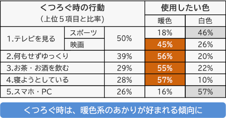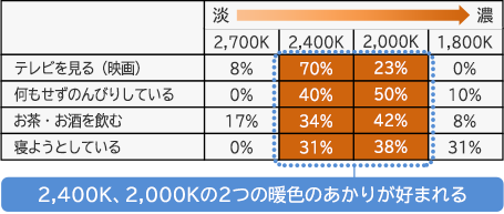 [リラックスのあかり]は、くつろぎの際に好まれる暖色系のあかりとして従来の電球色(2,700K)の他に、より深みのある2種類の暖色を加え、ボタンひとつで簡単に切替が出来ます。