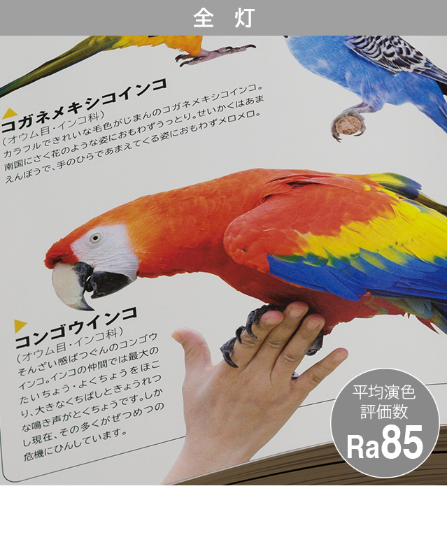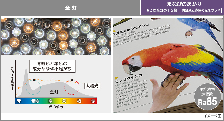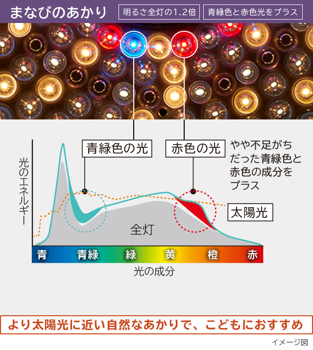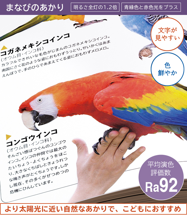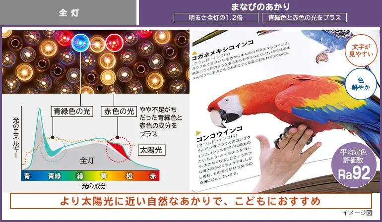 遊びや学習を通して成長するこどもには、見やすい明るさと本来の色を再現するあかりが大切です。[まなびのあかり]はしっかり明るく、さらに光の質を向上させる独自技術により、光の成分をより太陽光に近づけることで、高い演色性(Ra92)を実現。文字が見やすく、自然な色に見えるあかりです。