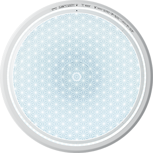 外周部に配置したLEDの光によって、点灯時に透明カバー表面に施したデザインが美しく浮かび上がる新しいかたちの照明です。
