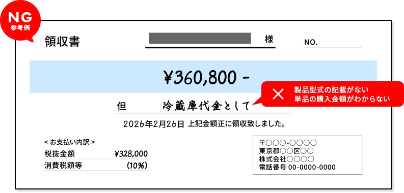 購入証明書は対象商品のレシートもしくは領収書、および製品銘板(品質表示板)です。