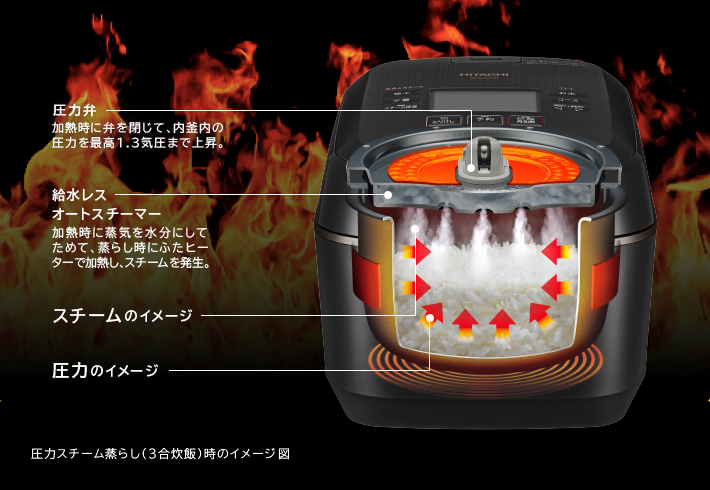 [給水レス オートスチーマー]にためた水分をスチームにして送り込み、ごはんをしっとり保ちます。