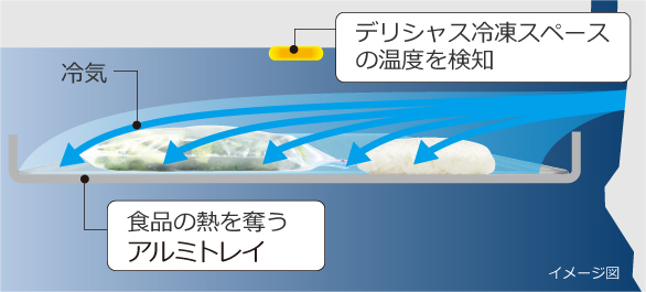専用の温度センサーが、デリシャス冷凍スペースの温度を検知し、自動で運転を切り替え、食品をすばやく冷凍します。