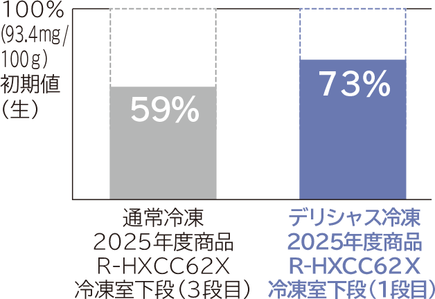 *1 2025年度商品R-HXCC62Xの冷凍室下段1段目(デリシャス冷凍、冷凍標準設定)と冷凍室下段3段目(通常冷凍、冷凍標準設定)との比較。室温約20℃、ドア開閉なし。牛ステーキ肉にラップをして庫内に保存し、最大氷結晶生成帯(-1℃から-5℃)を通過する時間を測定。1段目:約111分、3段目:約182分。