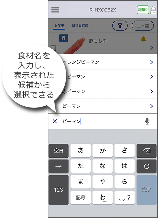 保存する食材を登録して一覧管理できます。食材名を入力すると約1,400種類※1の食材データから候補が表示され、選択するだけで、食材の画像やおすすめの保存場所などを自動で表示。手間なく手軽にリスト登録できます。
