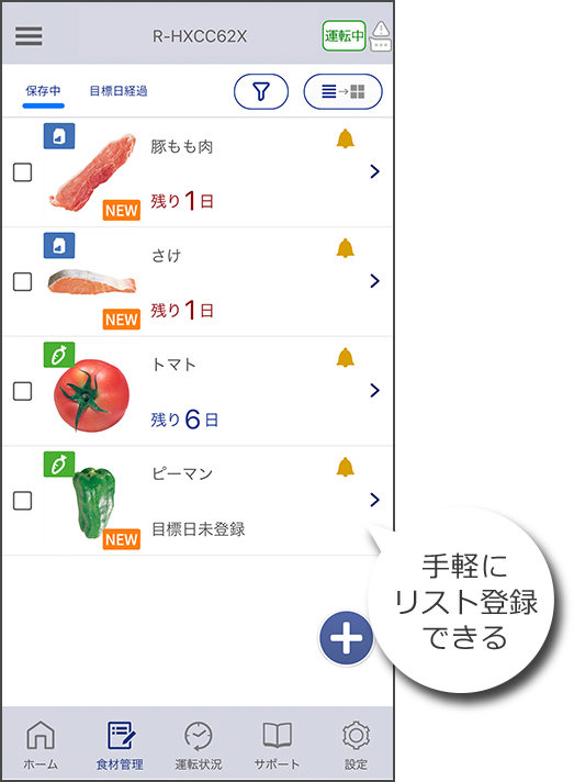 食材をリストで管理できる