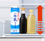 1段目の棚には、500mLペットボトルやドレッシングなどの容器を立てたまま収納可能。ドアポケットと使い分けてボトル類をたっぷり収納、整理整頓ができます。