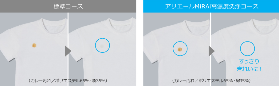 北:その通りです!アリエールMiRAiに合わせて高濃度で洗浄する時間を適正化することで、標準コースよりもカレーの汚れが残らないところまで洗浄力を上げることができました。食べ物をこぼすことが多い小さいお子さまがいるご家庭におすすめですね。