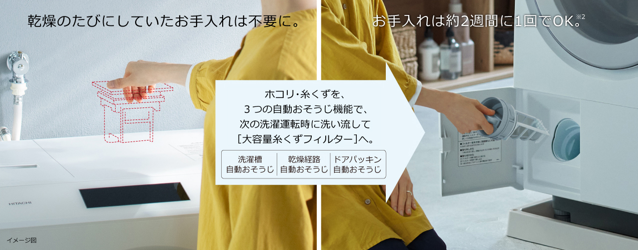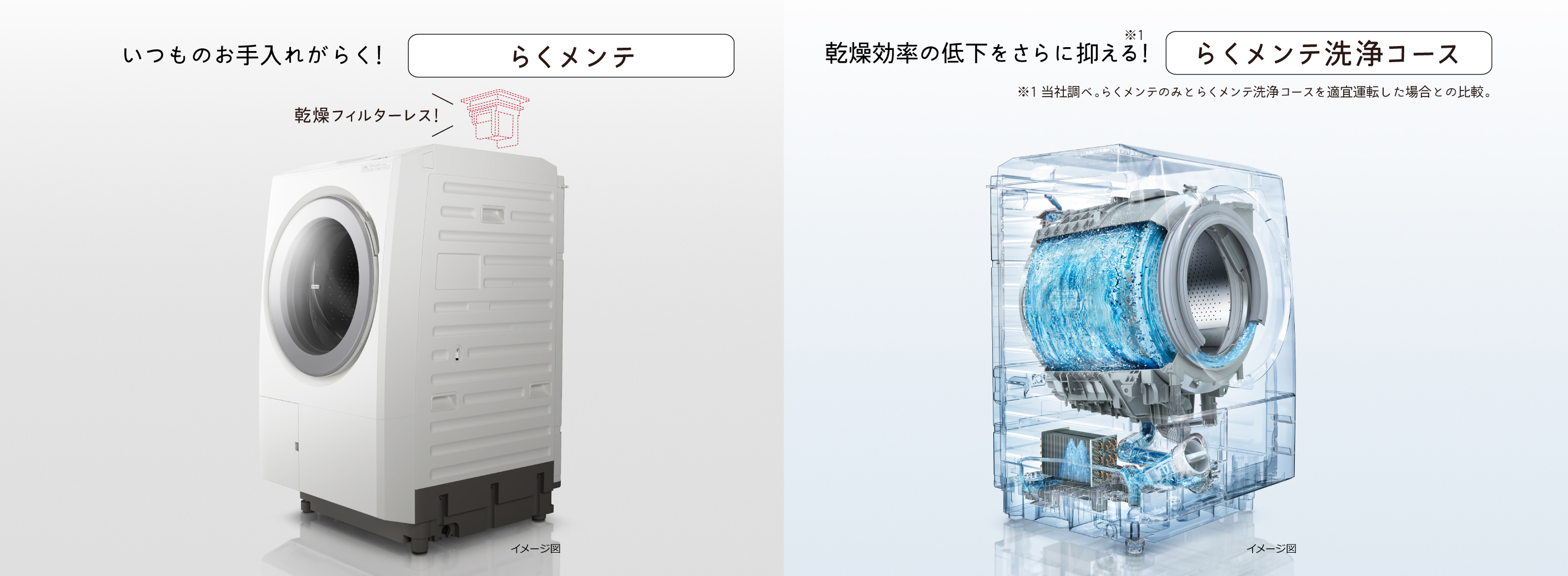 ※BD-SW120M・SV120Mは、形状・構造が異なります。 ※洗濯槽用または衣類用の塩素系漂白剤をご使用ください。 ※らくメンテ洗浄コースを運転するタイミングは、使用状況に応じて操作パネルでお知らせします。すべての乾燥機能が改善するわけではありません。