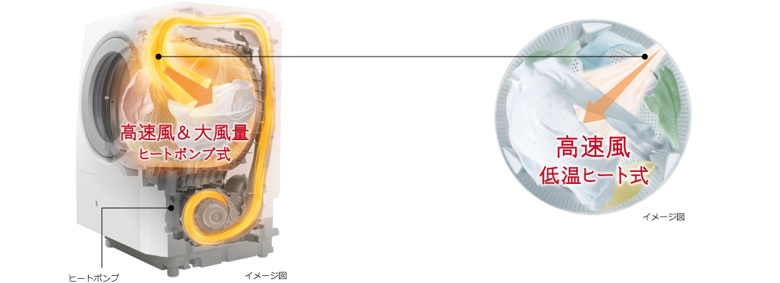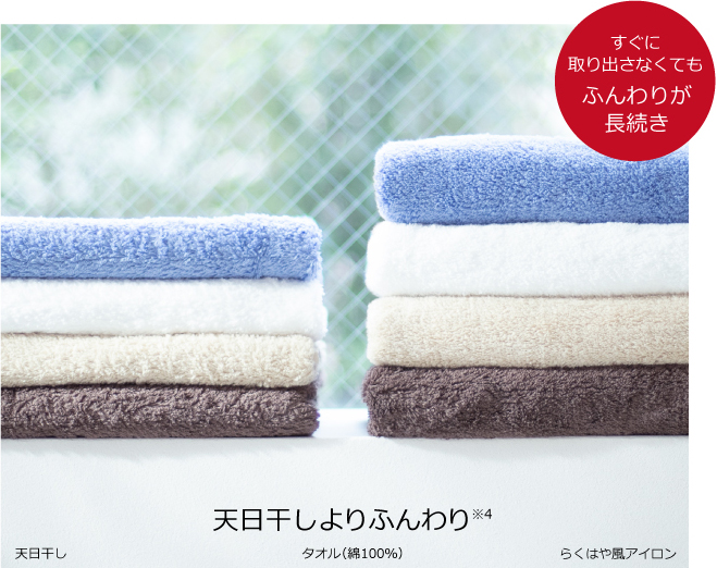 ※3 当社調べ。衣類乾燥機DE-N60HV(洗濯後の衣類3kgを乾燥、標準コース)と、ドラム式洗濯乾燥機2023年モデルBD-STX130J(BD-STX130Mと同等性能の機種)(洗濯〜乾燥3kg時、標準コース)との比較。※4 当社調べ。2023年モデルBD-STX130J(BD-STX130Mと同等性能の機種)(洗濯後の衣類3kgを天日干し)と(洗濯~乾燥3kg時、標準コース)との比較。※衣類の量や素材、一緒に乾燥するものの種類によって仕上がりが異なります。
