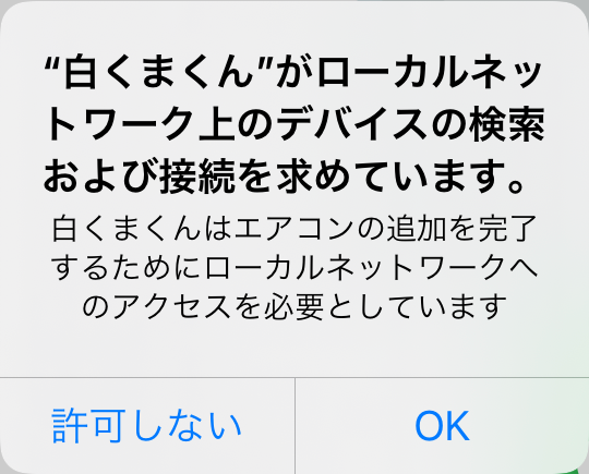 ※iOSのバージョンが14以上の方は「エアコンを追加する」をタップ後に表示されるローカルネットワークの権限の許可を求める画面で「OK」をタップしてください。「許可しない」をタップした場合はエアコン登録に失敗します。許可しないを選択後の権限の変更はスマートフォンの設定の白くまくんアプリを開いて変更してください。