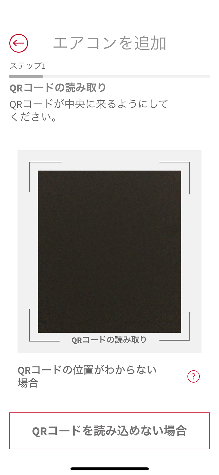 ※無線LAN内蔵機種の場合、QRコードを記載しているラベルはエアコンに同梱して、取扱説明書に貼付いただいています。また、一部の機種にはエアコンの前面パネルを開けた位置にもラベルを貼り付けています。取扱説明書にエアコンにも貼り付けていない場合は「QRコードを読み込めない場合」をタップして進めてください。