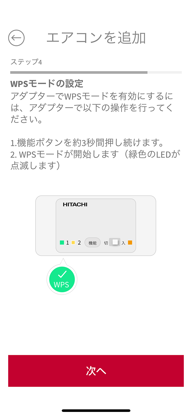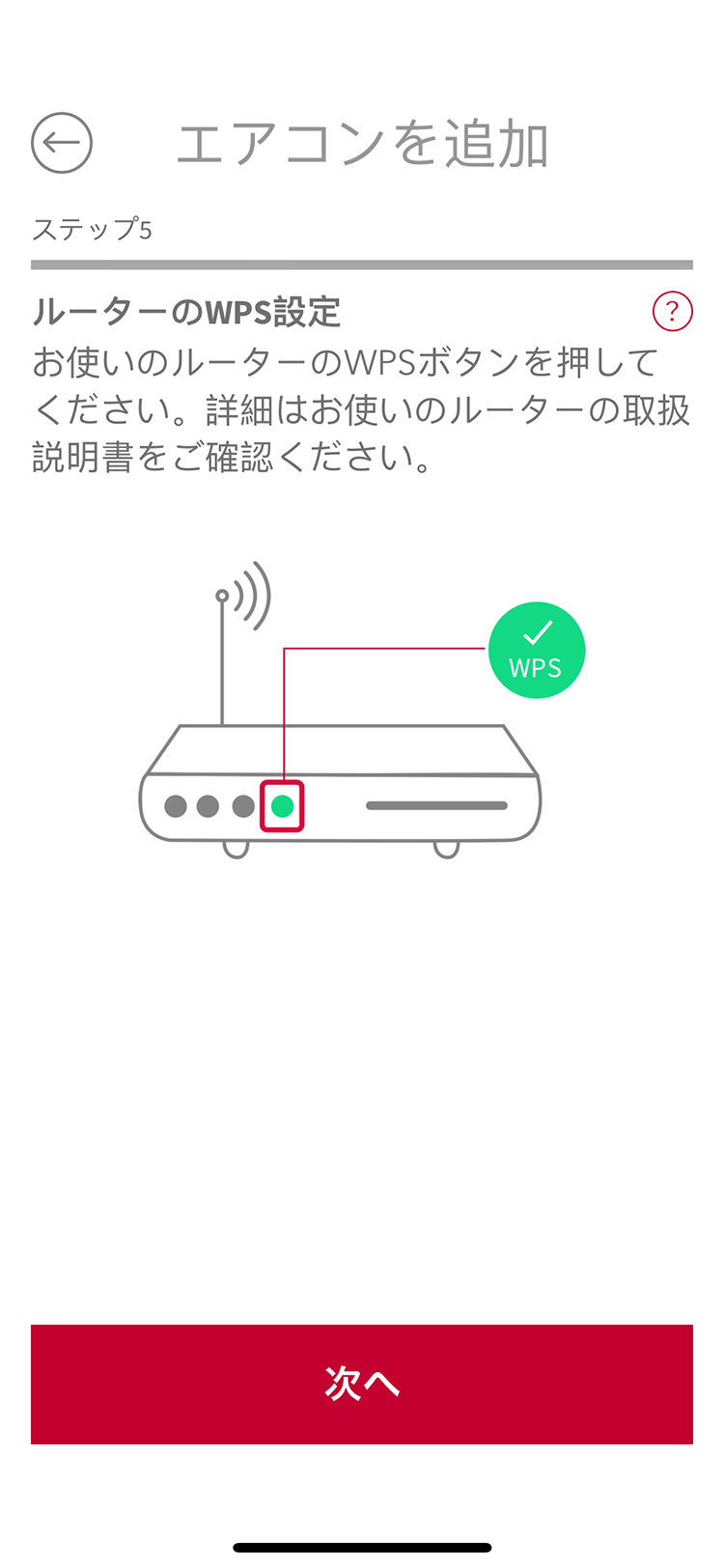無線LANルーターを操作してWPS接続状態に設定し、「次へ」をタップする。