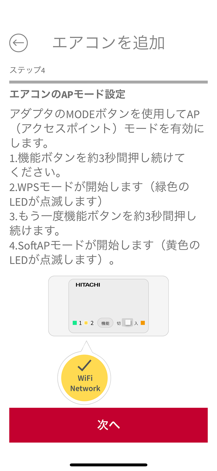 無線LAN内蔵機種の場合は、エアコンのリモコンを使ってエアコンをWPS方式で接続するモードに設定し、遠隔ランプが点滅したら「次へ」をタップする。