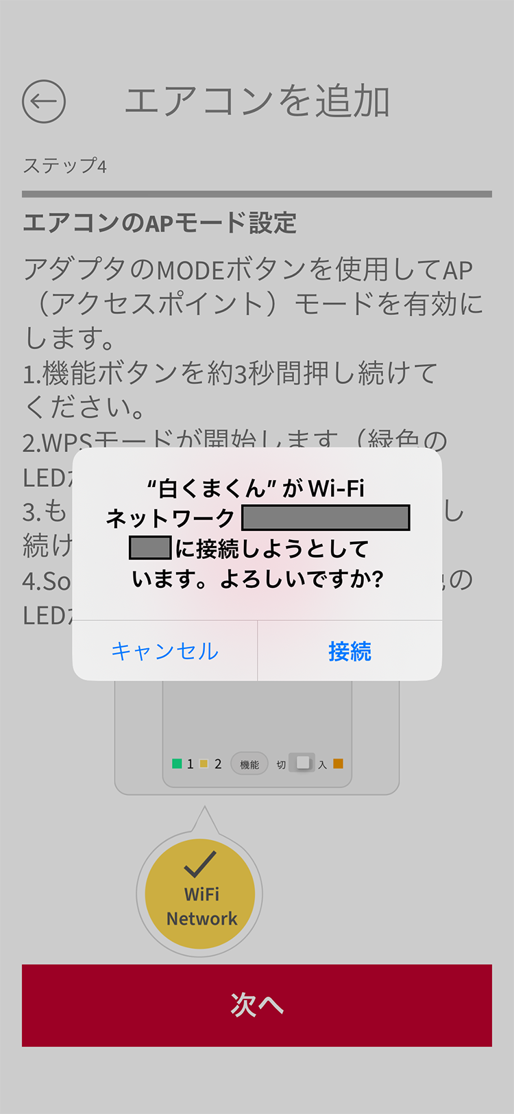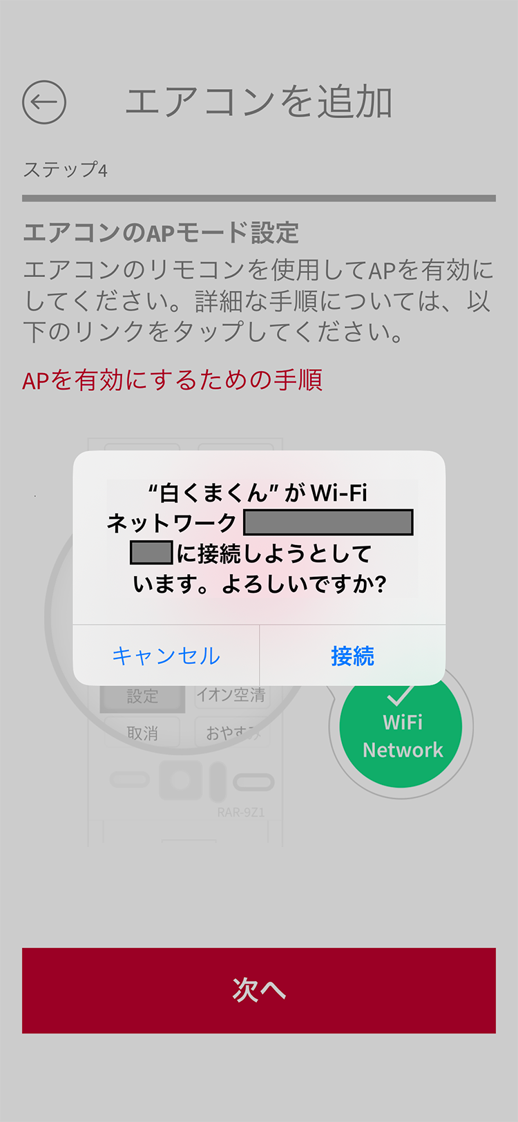 エアコンがAP接続モードになるとアプリはエアコンのネットワークに自動的に接続する。確認画面が表示されるので「接続」をタップする。