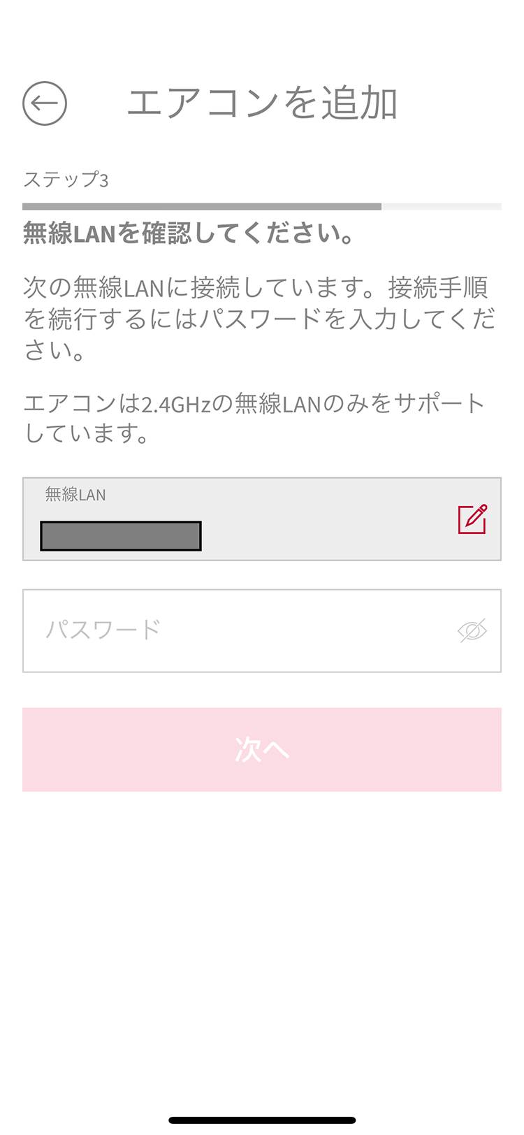 ※接続する無線LANは下記を満たす必要があります。いずれかを満たしていない場合、エアコン登録の失敗の原因になることがあります。●IEEE802.11b/g/n(周波数は2.4GHz、暗号化方式がWPA2またはWPA(いずれもTKIP またはAES)であること。5GHzおよびWPA3の無線LANには対応しません。対応していない無線LANと接続している場合はエラー表示する場合があります。
