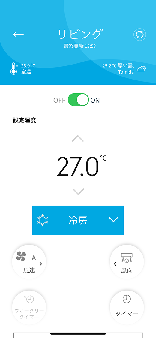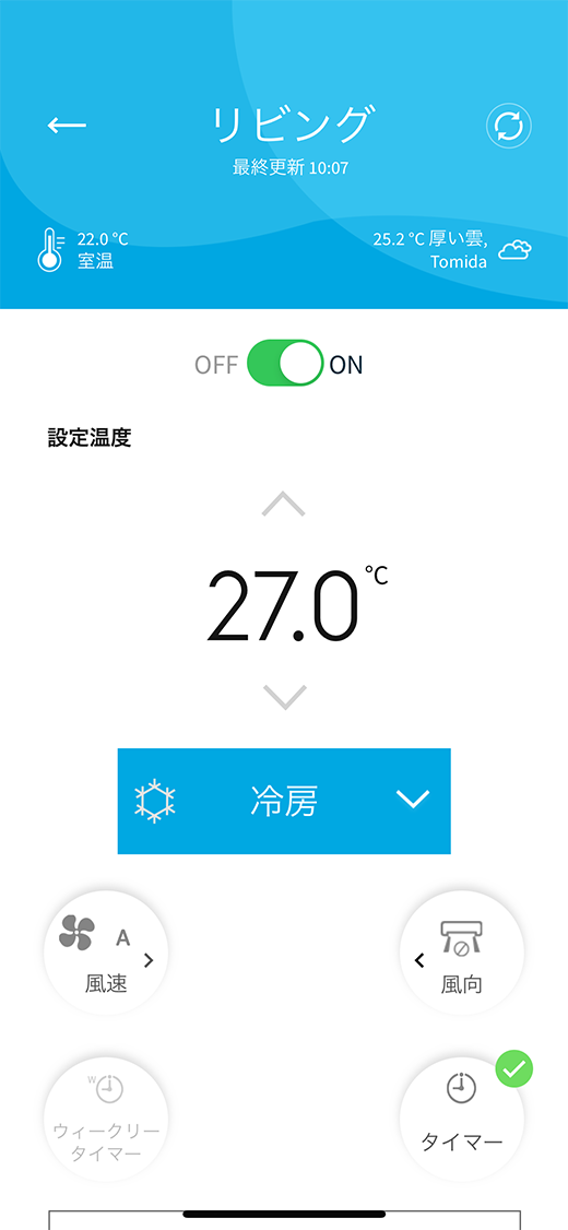 設定が完了するとエアコン操作画面のタイマーアイコンにチェックマークが付きます。