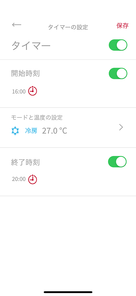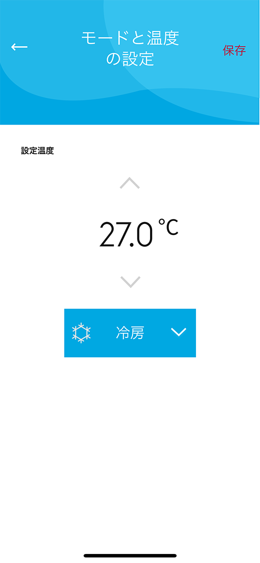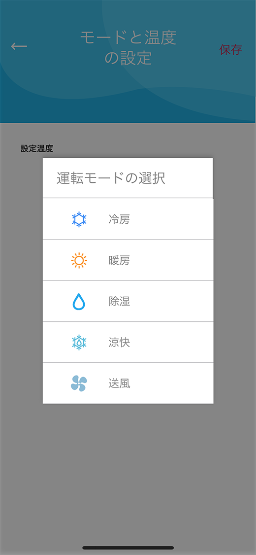 運転モードを選択後、設定温度を設定し、右上の「保存」をタップする。