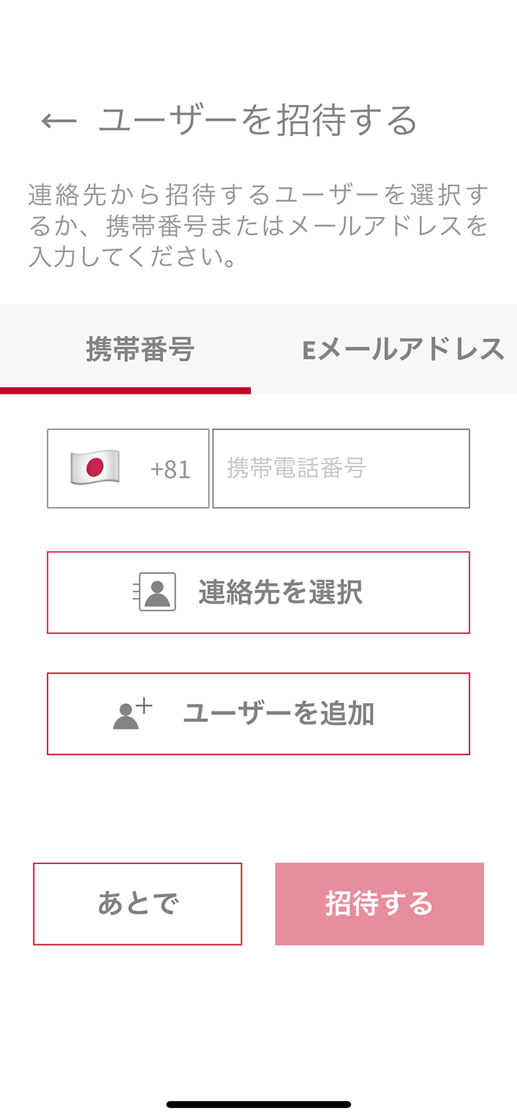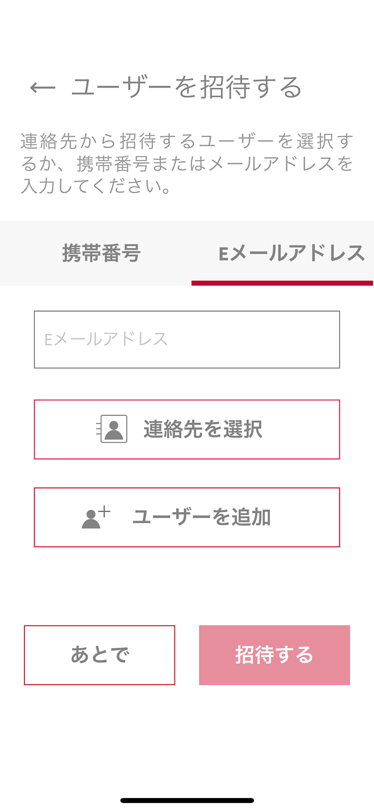 追加するユーザーの電話番号またはメールアドレスを入力して「ユーザーを追加」をタップし、「招待する」をタップする。