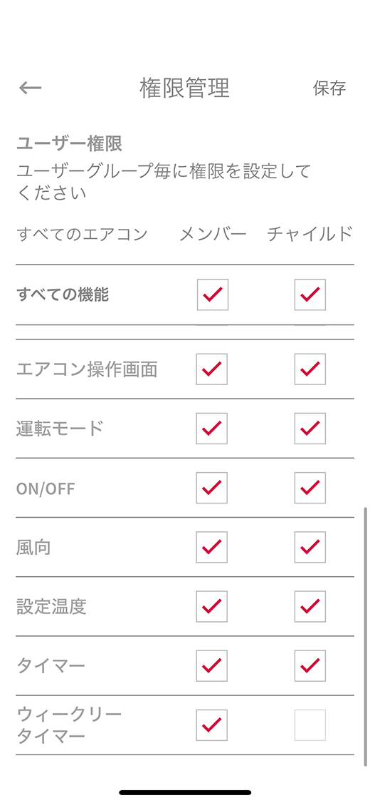 「メンバー」「チャイルド」が操作可能な項目をチェックし、右上の「保存」をタップする。