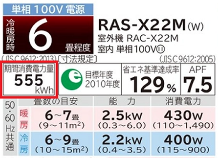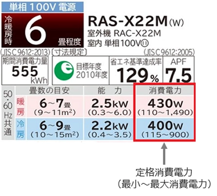 RAS-X22Mの消費電力は、暖房時「110W~1,490W」、冷房時「115W~900W」です。1時間あたりの電気代の目安は以下になります。