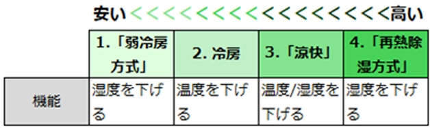 一般的に、除湿には「弱冷房除湿」と「再熱除湿」などの方式があり、方式によって消費電力が変わります。