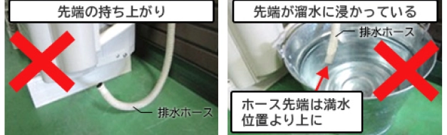 ・排水ホースの先端がたまり水に浸かっている