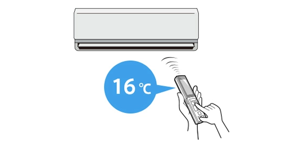 運転モードを「冷房」に設定し、最低設定温度の16℃に下げて、約10分間運転します。