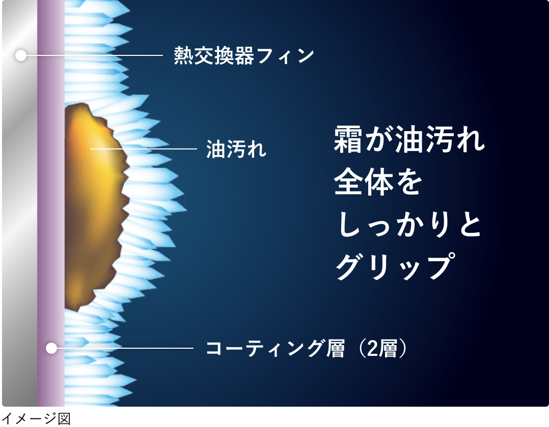 「凍結洗浄」は、凍結により霜が油汚れ全体をしっかりグリップ。