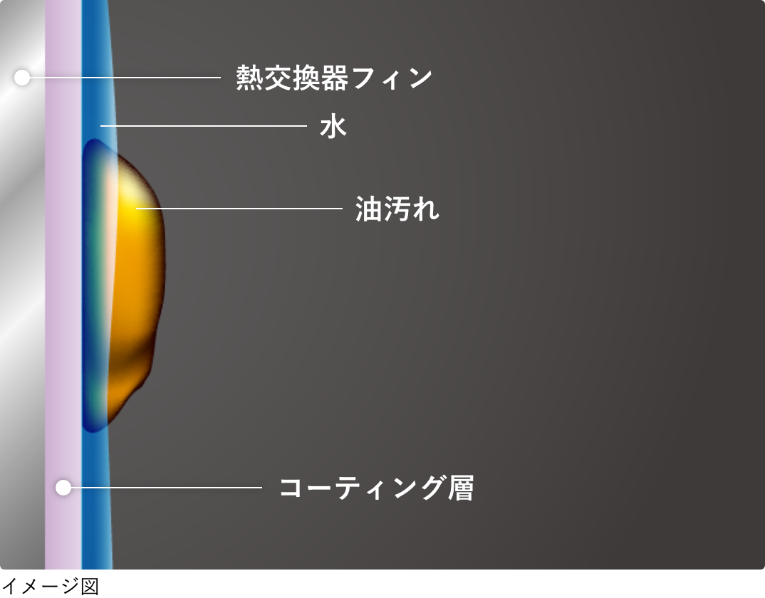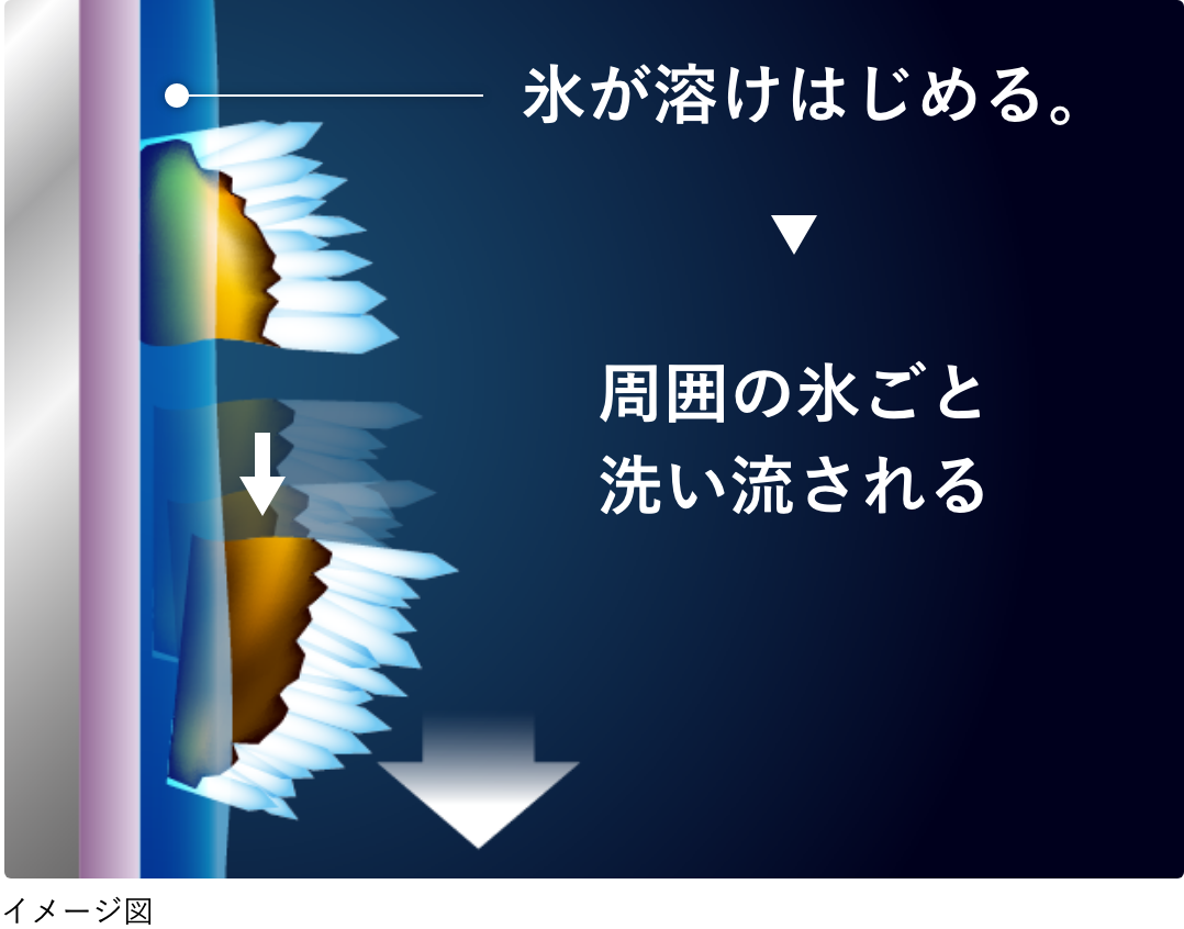 フィンとコーティングに接した部分の氷が溶けはじめると、周囲の氷ごと油汚れが引き剥がされて洗い流される。