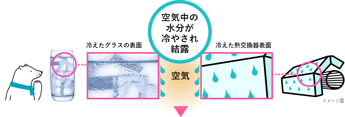 冷房・除湿運転時もこれと同じ原理で、空気中の水分が熱交換器に冷やされて結露して水が集められているのです。発生した水がホースから外に出ているのがそうです!