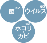 ※2 設置環境、使用状況により効果は異なります。試験機関:(一財)北里環境科学センター。ウイルス試験は1種類のウイルスのみで実施。