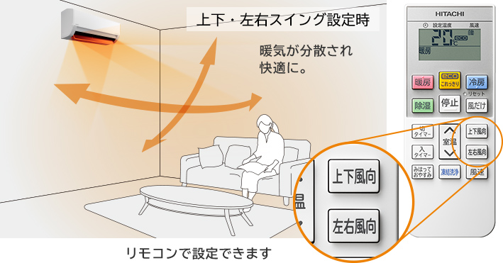 上下フラップに加え、左右ルーバーも連続的にスイングさせたり、好きな角度に固定させたりできます。