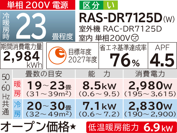 低温暖房能力とは、外気温の低い時(外気温2℃時:JIS低温条件時)の暖房能力です。暖房能力を重視する時には、これも目安にお選びください。