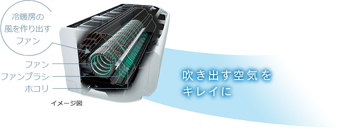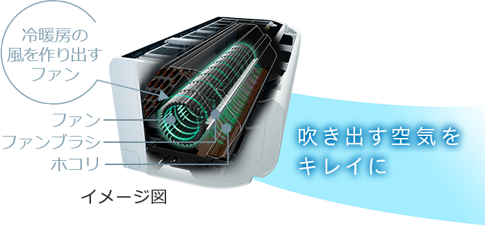 ファンを逆回転させ、ブラシで落としたホコリは熱交換器の汚れとともに洗い流します。