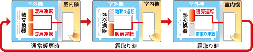室外機の熱交換器を2つに分割。通常暖房時は両方の熱交換器で暖房運転。霜取りが必要な時でも、片方の熱交換器では暖房運転を継続します。