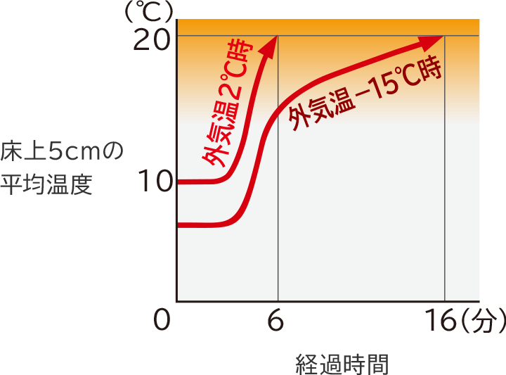 外気温2℃時ではわずか約6分で、すばやく足もと(床上約5cm)を暖めます。