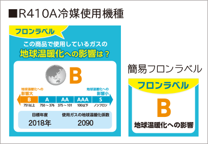 このラベルは、フロン排出抑制法に基づく指定製品に使用されている冷媒フロンの環境影響度として用いられている地球温暖化係数(GWP)について、定められた目標への達成度を表したものです。製品を選択する時のご参考にしてください。家庭用エアコンは、出荷台数で加重平均した環境影響度として用いられている地球温暖化係数(GWP)の値が、目標年度(2018年)において目標値(750)を上回らないことが、製造事業者等に義務付けられております。