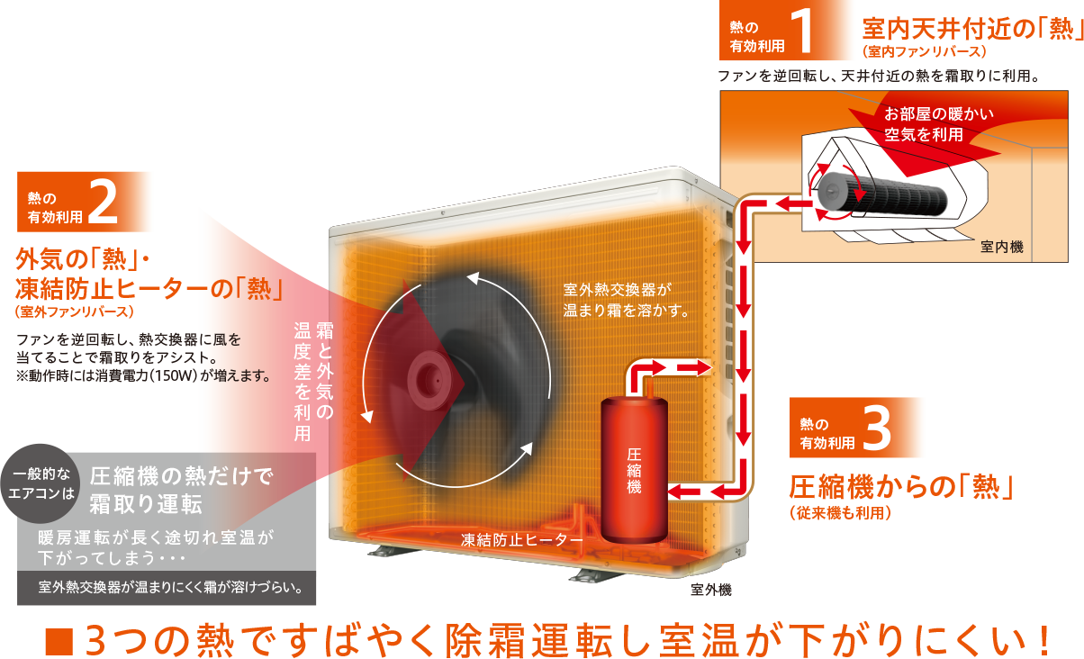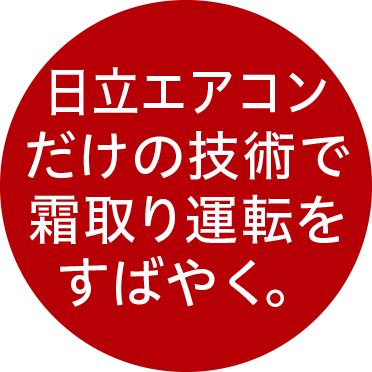室内機と室外機のファンを逆回転させ、室内の熱と外気の熱を熱交換器に送ります。霜取り運転時間を約25%短縮※3する独自技術により、室温低下時間を短くします。