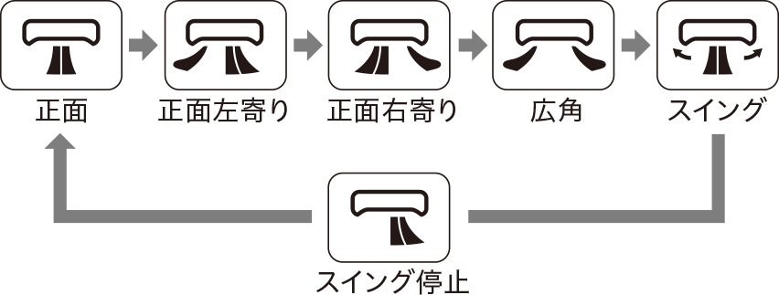 リモコンの左右風向ボタンを押すごとに風向が切り替わります。