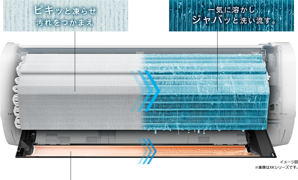 フィルターを掃除してもついてしまう内部のカビやホコリ、油汚れは、熱交換器を凍らせ、たくわえた霜を一気に溶かして洗い流します。