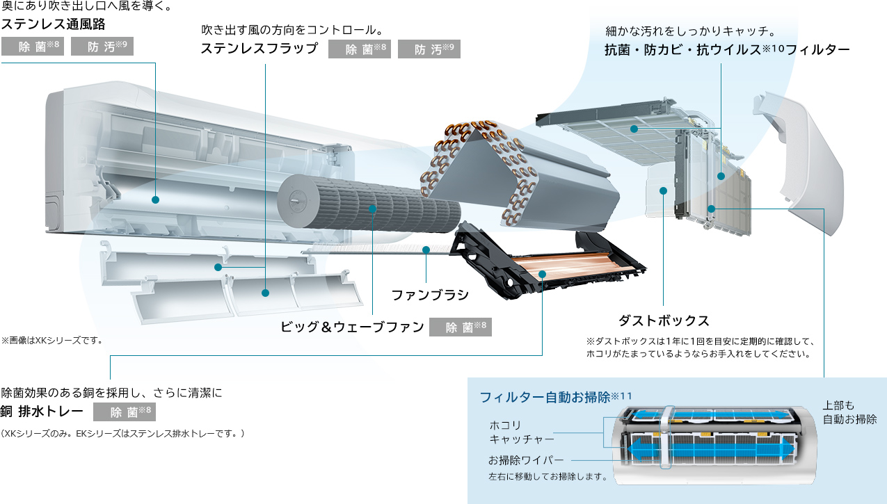 素材にも清潔性の高いステンレスを採用し、エアコン内部の菌※8や汚れ※9を抑制します。