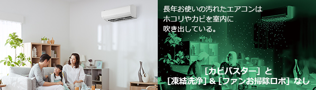※13 試験機関:(一財)北里環境科学センター。室温約27℃、湿度約70%。【試験動作】[カビバスターなし]:毎日6時間冷房運転を2週繰り返し。[カビバスターあり]:毎日6時間冷房運転後、1~6日目までは[カビバスター]設定によるエアコン内部乾燥運転&プラズマイオン充満運転、7日目は[カビバスター]運転(プラズマイオン充満運転+加熱・低湿制御)+[凍結洗浄]&[ファンお掃除ロボ]運転。このサイクルを2週繰り返し。【吐出空気のカビ個数の比較】対象部分:熱交換器・通風路・ファンにカビ菌を塗布し、上記運転を2週繰り返し後の吹き出す空気を採取。1m3当たりの空気に含まれるカビ菌数を比較。99%以上低減。