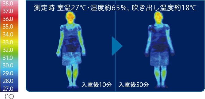 30~50歳代女性11名。エアコンの据え付けてある壁から約2.5m離れた位置。皮膚温度は腕部、脚部の平均値。快適感は官能評価。