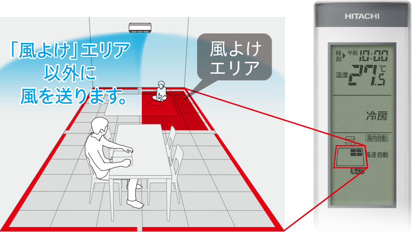 ひとつのエリアを「風よけ」エリアに選択すると、そのエリアへの送風を避けながら気流をコントロールします。