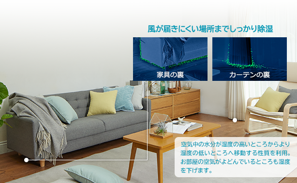空気中の水分が湿度の高いところからより湿度の低いところへ移動する性質を利用。お部屋の空気がよどんでいるところも湿度を下げます。